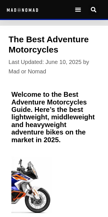 madornomad.comh2: The Best Adventure Bikes,What you’ll find in this guide,What we mean by ‘Adventure Motorcycles’,The Best Adventure Motorcycles of 2025,The Best Lightweight Adventure Motorcycles,The Best Middleweight Adventure Motorcycles,The Best Heavyweight Adventure Motorcycles,Read more on adventure motorcycles,56 thoughts on “The Best Adventure Motorcycles”